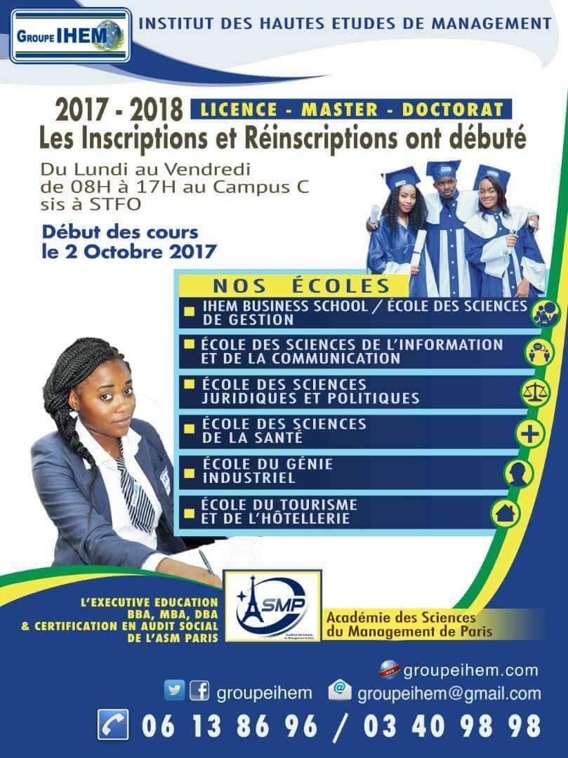 Les inscriptions et réinscriptions pour 2017-2018 ont débuté. Elles ont lieu du lundi au samedi, de 08h a 17h, au campus c de l'institut sis à stfo derrière les eaux et forêts, entrée face à promogabon, dans toutes nos filières et options de la lp1 en master 2.